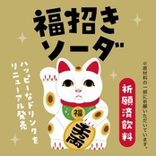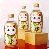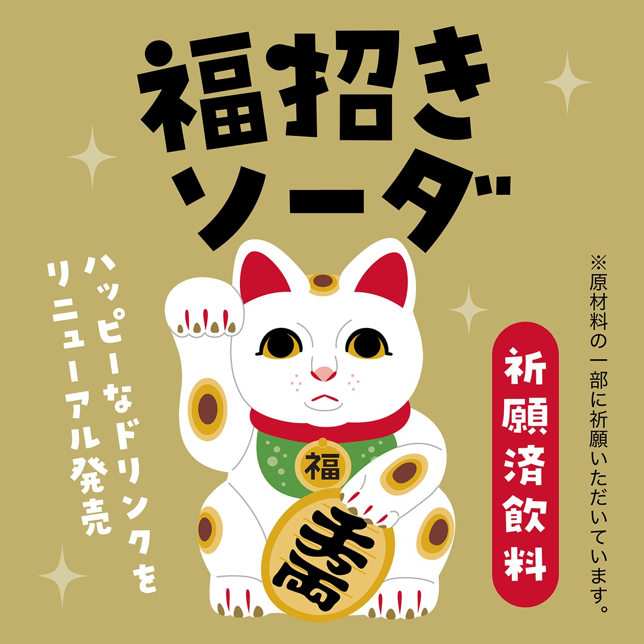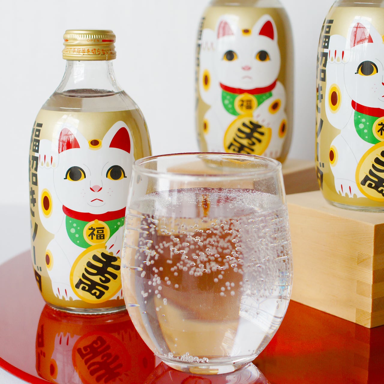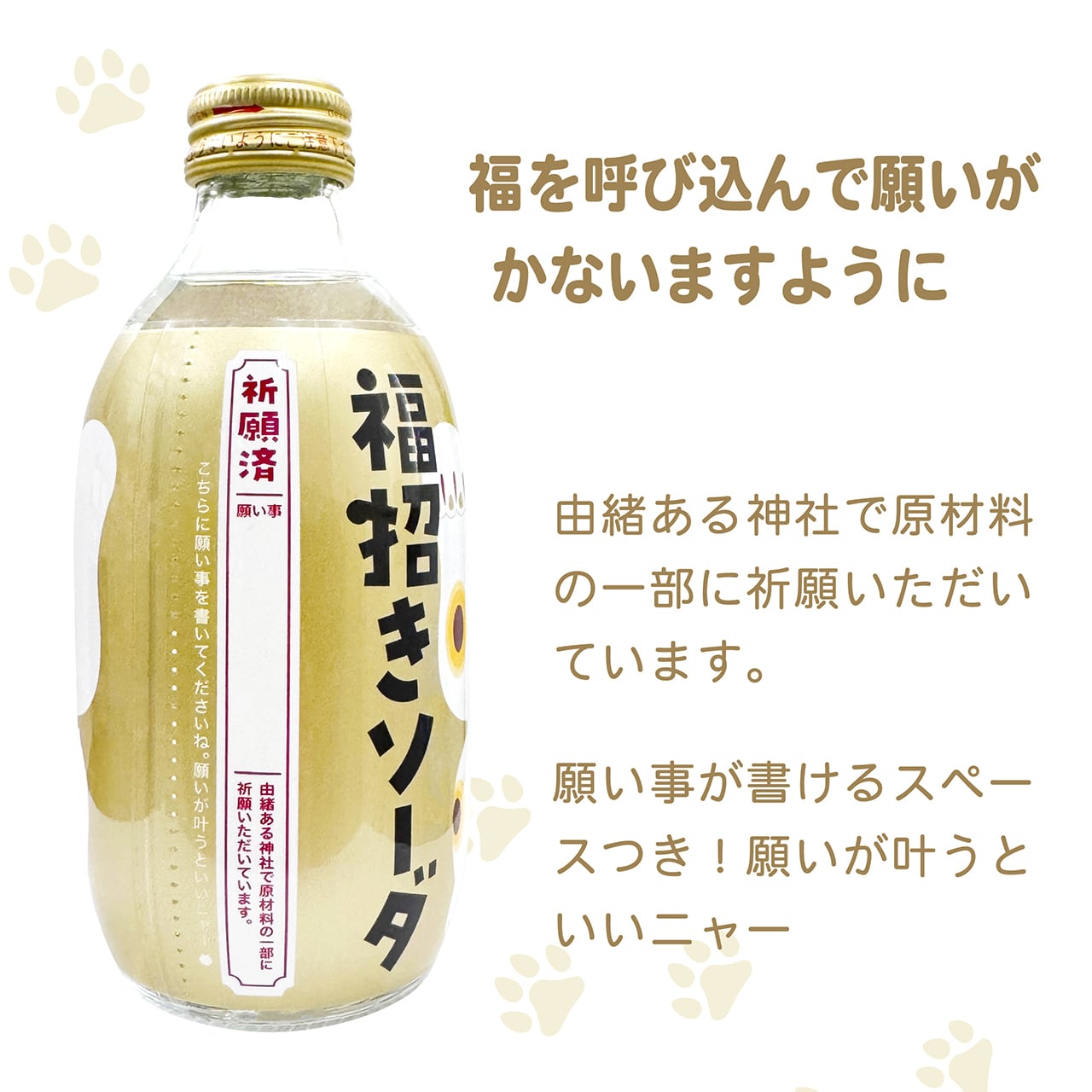 祈願済み!福招きソーダ。ふっくらハッピーな猫のイラストに変更してリニューアル。静岡県内の神社で原材料の一部に祈願いただいております。福を招くと言われ、海外でも「Lucky Cat」として親しまれている招き猫をパッケージに採用しました。サイドには願い事を書けるスペースつき♪日本らしいお土産として、ギフトにも最適です。